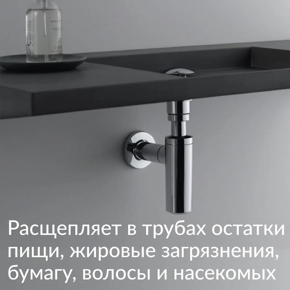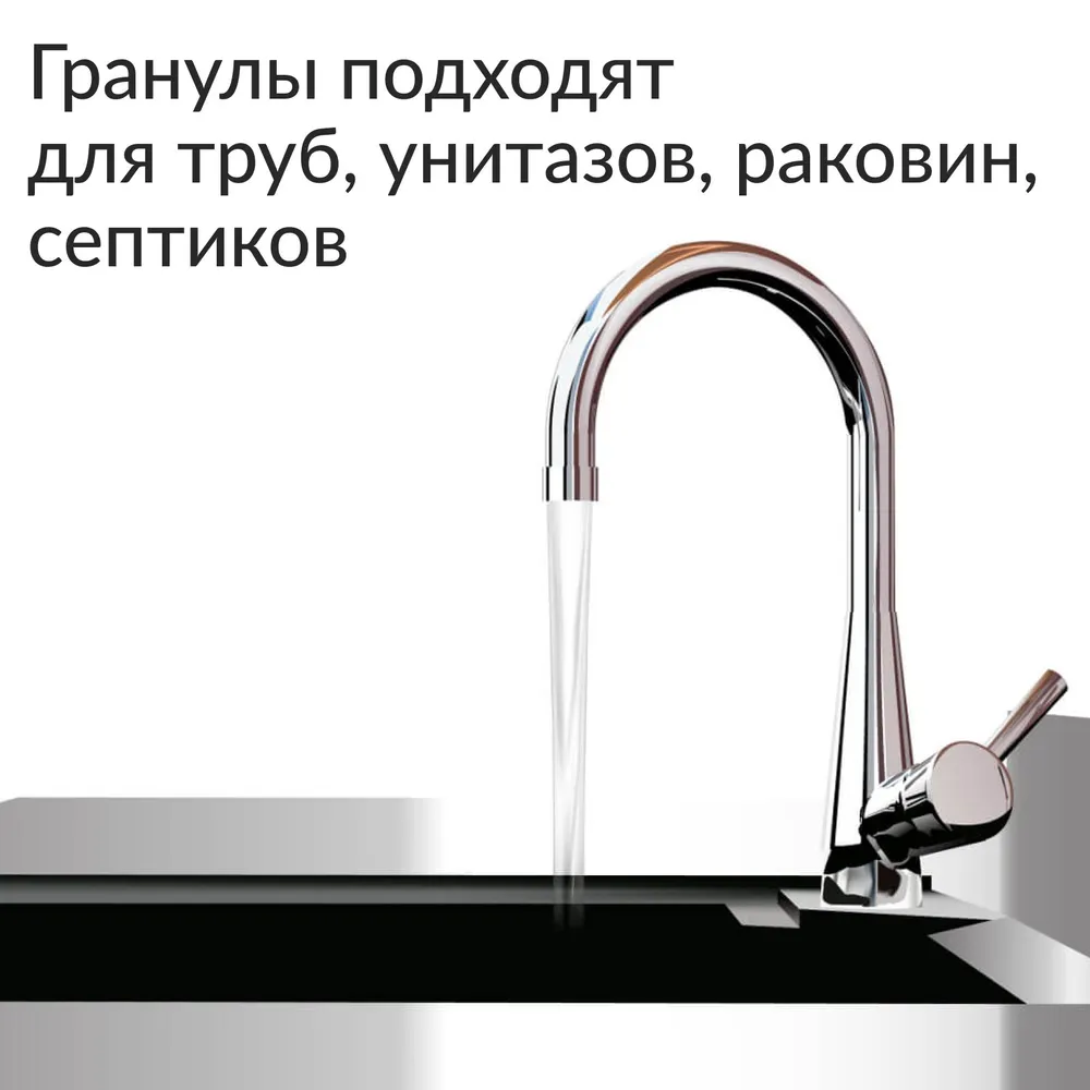 Гранулированное средство является высокоэффективным решением для быстрого устранения и профилактики сложных засоров, также устраняя неприятные запахи. Эффективно расщепляет остатки пищи, жиры, бумагу, волосы и насекомых, не нанося вреда трубам. Подходит для всех типов труб, включая пластиковые, а также для унитазов, раковин и септических систем. Оборудован безопасным колпачком, предотвращающим доступ детей. Гранулы обеспечивают экономичное использование, превосходя жидкие средства аналогичного назначения в пять раз по эффективности расхода.