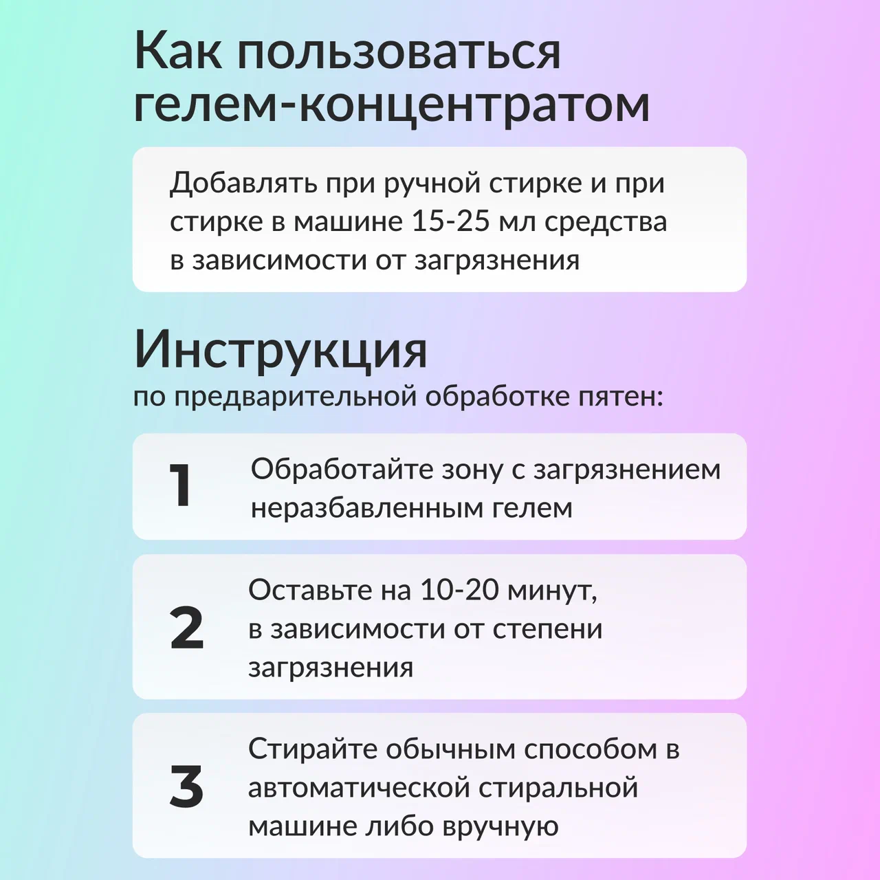 Концентрированный гель для стирки цветного белья, который благодаря коллагену и эфирным маслам бережно очищает и сохраняет яркость цветов. Эффективен для всех видов стирки, включая замачивание и обработку пятен. Энзимы глубоко проникают в волокна, избавляя от запахов и грязи, в то время как коллаген предотвращает образование катышек и упрощает глажку, защищая цвет. Уникальный комплекс арома-масел дарит одежде свежий аромат.